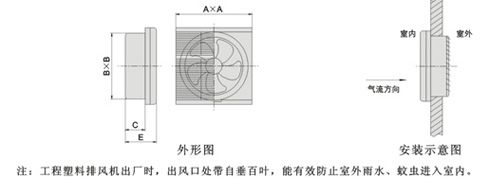 二、工程塑料型排風(fēng)機(jī)外形及安裝示意圖 ![]() 注:工程塑料排風(fēng)機(jī)出廠時(shí),出風(fēng)口處帶自垂百葉,能在效防止室外雨水、蚊子進(jìn)入室內(nèi)。 三、金屬型排風(fēng)機(jī)外形及安裝示意圖 ![]() 注:金屬型排風(fēng)機(jī)出廠時(shí),一般不帶自百葉,直接安裝在隔窗或墻上。也可帶自垂百葉或防雨彎頭,自垂百葉可與風(fēng)機(jī)連機(jī)出廠整體安裝,也可分離出廠獨(dú)立安裝。訂貨時(shí)請(qǐng)說(shuō)明! |