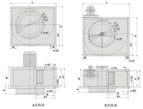 本系列風機分A式直聯傳動和E式皮帶傳動,按葉輪旋轉方向分為左旋和右旋,旋轉方向從電機或皮帶輪側看為準,以出風口分為00、900、1800、2700四種出風方式,訂貨時需注明。